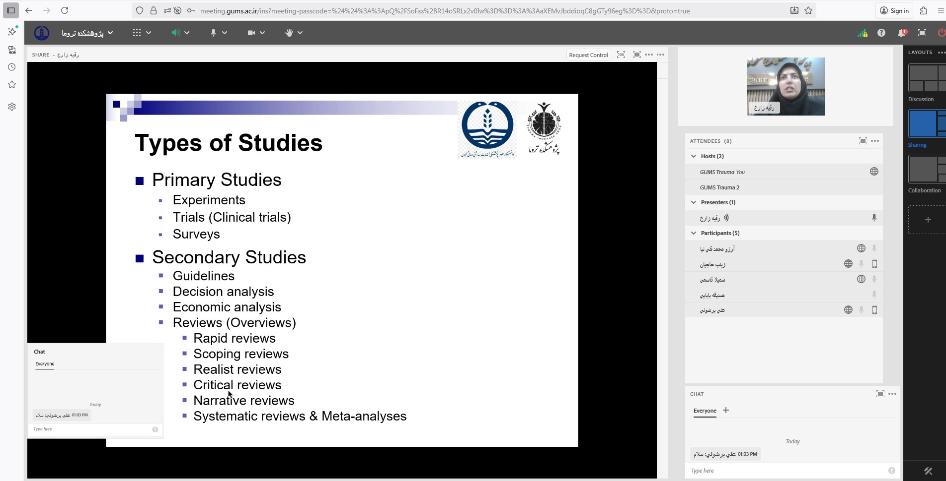 دومیین روز دراین دوره دکتررقیه زارع با عنوان انواع مطالعات مروری و مرور نظامندو دکتر رقیه فرهادی با عنوان متاآنالیز و Stataصحبت نمودندو در پایان با شرکت کنندگان به بحث و تبادل نظر پرداختند.