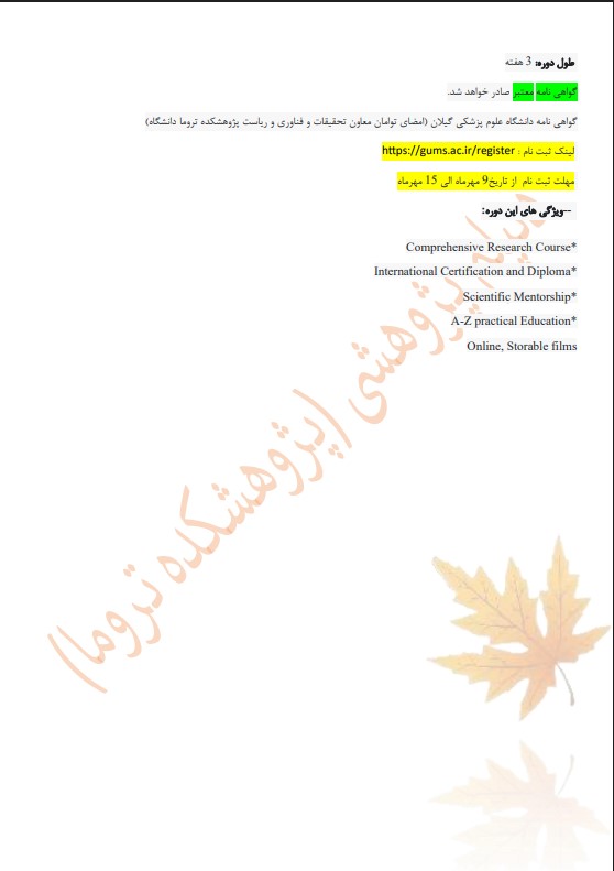 جهت ثبت نام در این دوره از تاریخ 9 لغایت 14 مهرماه 1404به مدت 5 روز به سایت پژوهشکده تروما مراجعه بفرمائید.